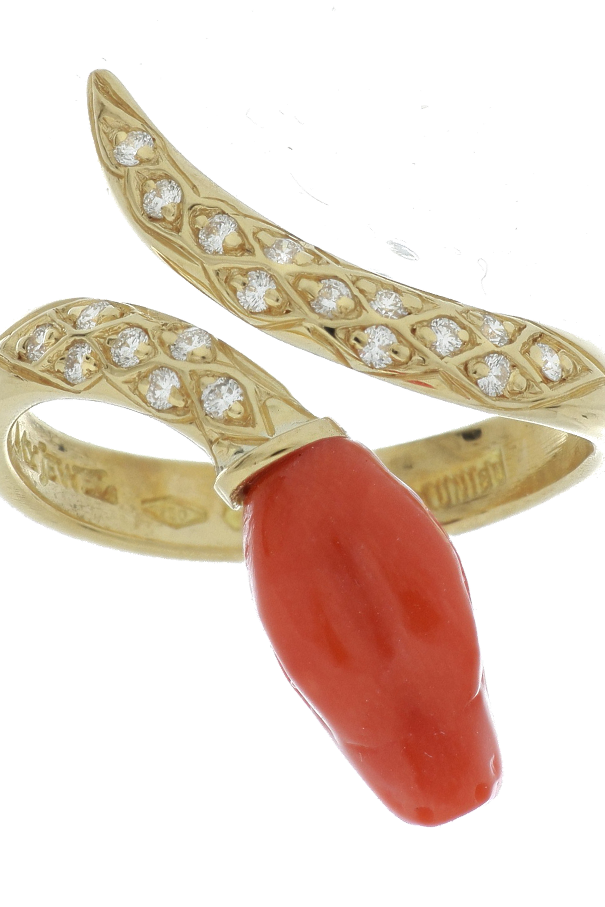 ANELLO IN ORO GIALLO 18Kt CON CORALLO INCISO E DIAMANTI